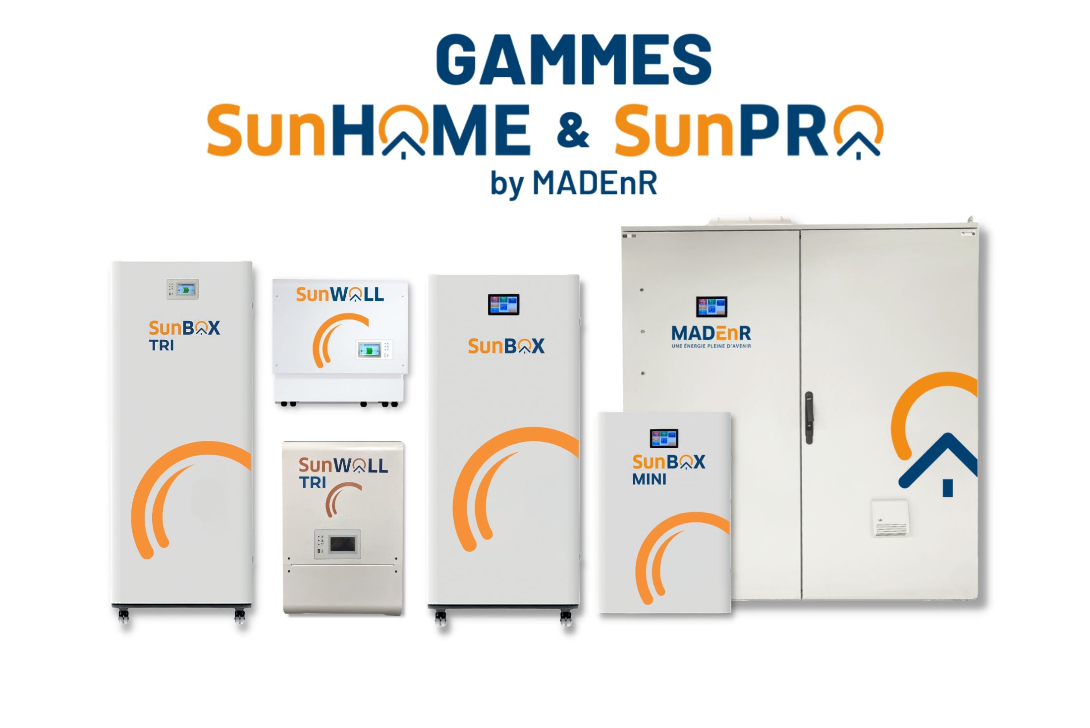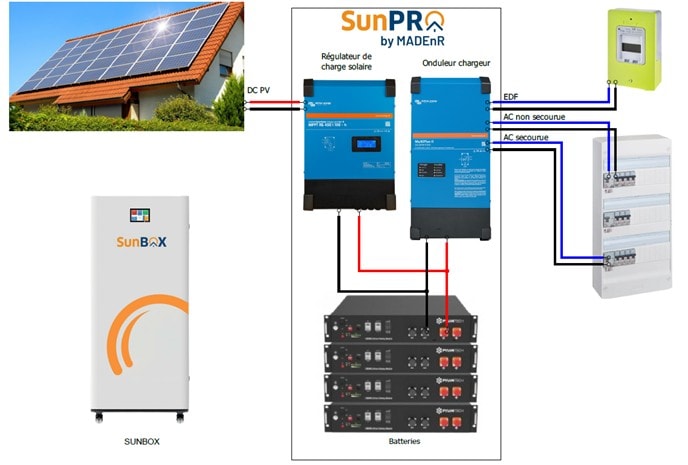 Systèmes hybrides intégrant un onduleur pour installations photovoltaïques nouvelles ou existantes. Solutions pour stocker le surplus d’énergie électrique produite afin de l’utiliser le soir, la nuit ou le jour au lieu de l’envoyer dans le réseau, ce qui permet de maximiser l’autoconsommation et l’indépendance énergétique. Systèmes intégrés « all-in-one » dont tous les éléments sont contenus dans un seul boîtier élégant. Batteries au Lithium-Fer-Phosphate (LiFePO4) modulable de 2,4 à 14,4 kWh avec des puissances livrables de 3 à 10 kVAC. Alimentation même en cas de black-out (instantanée pour les SunMini et SunBox ou moins de 2 s pour les SunWall) et continuité de la production photovoltaïque. Système de monitoring gratuit. Conformes UTE C15-712-1/2/3 VDE0126 et EN/IEC 61427. Garantie constructeur de 8 ans, extensible à 12 ans, batteries incluses. Veillez à installer votre équipement : Dans un endroit sec, couvert, non inondable, non potentiellement explosif, à l’abri des rongeurs, loin des matières inflammables Pas directement au soleil À bonne distance des murs pour une bonne ventilation (cf. notice d'installation suivant modèle) Sur une surface capable de supporter le poids de l’équipement Sur un plan vertical avec une inclinaison maximale de 5° pour les modèles qui se montent au mur.