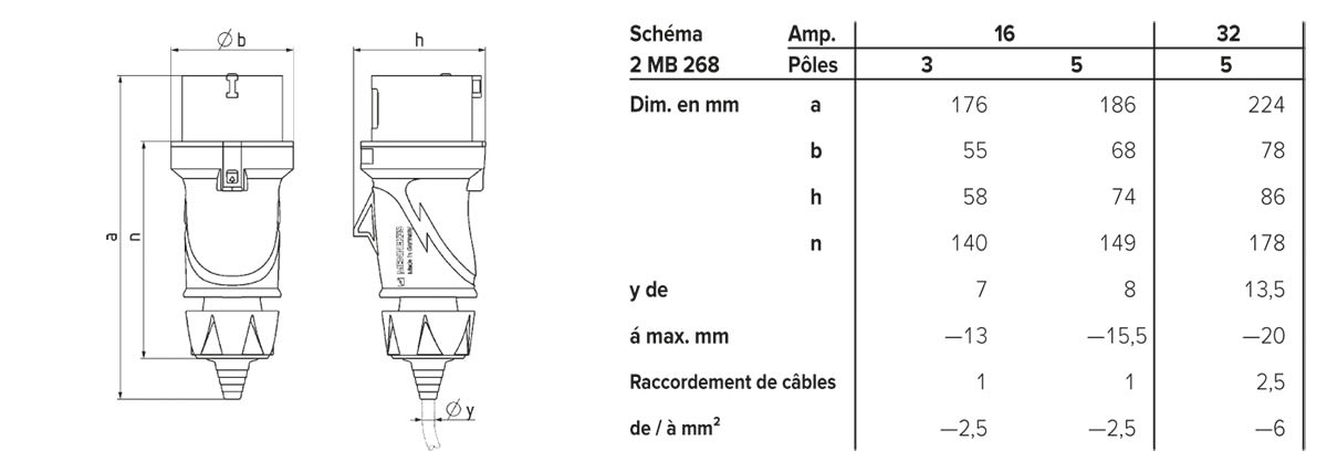 Fiche CEE PowerTOP Xtra G 32A 5p 6h 400V IP54boîtier ergonomiqueraccord à vis caoutchoutétechnique de vissageporte-contacts résistant à la chaleurcontacts nickelésavec passe-câble