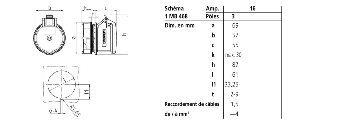 MENNEKES ELECTROTECHNIQUE FRANCE - Prise a enc. 16A 3P 6h 230V IP44 - 997