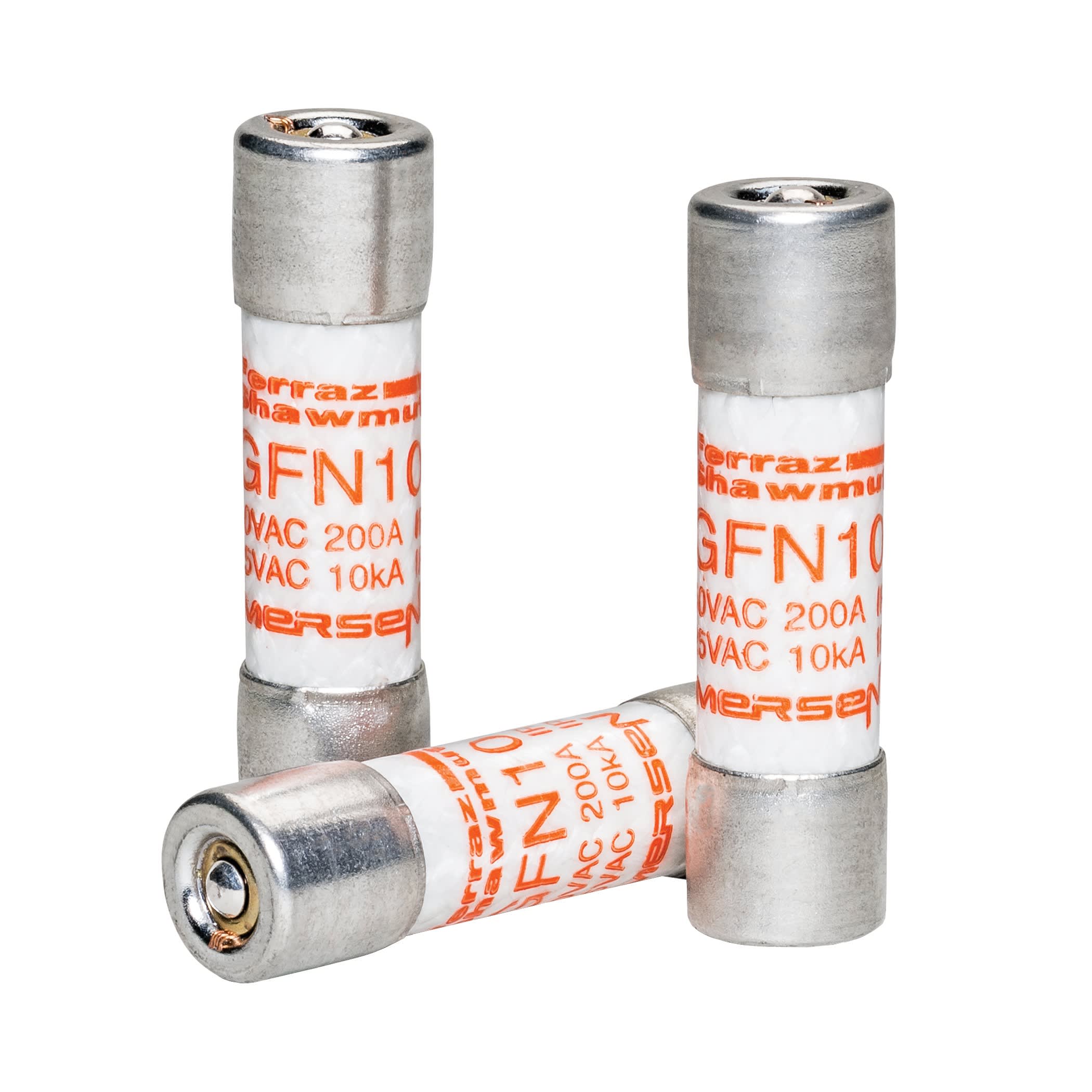 Les fusibles Midget GFN avec indicateur sont disponibles de 1/10 à 30A. Ces fusibles à action temporisée possèdent un indicateur de fusion visuel situé à l'extrémité du fusible pour indiquer l'ouverture du circuit. Les indicateurs peuvent être utilisés avec des microcontacts pour une indication à distance ou visuelle. (Ne pas utiliser sur les circuits de distribution.)