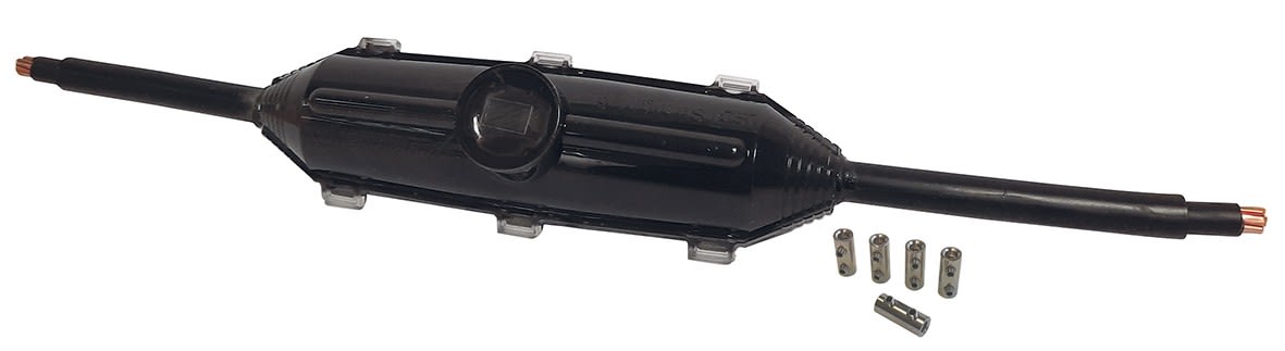 Boîte résine jonction 4x35mm² (355x72x72mm), livrée avec 4 connecteurs 16-35. Pour protection, isolation et étanchéité des connections électriques BT (1kV).