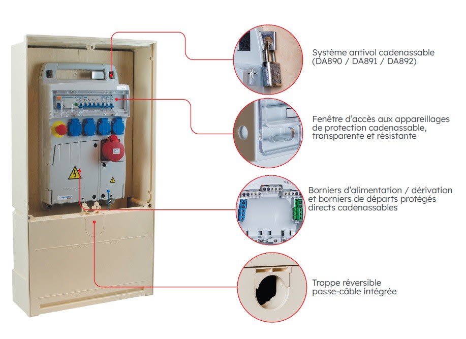 La borne DA891 permet l'installation définitive ou provisoire de points de distribution extérieurs , avec la protection de l'alimtentation électrique