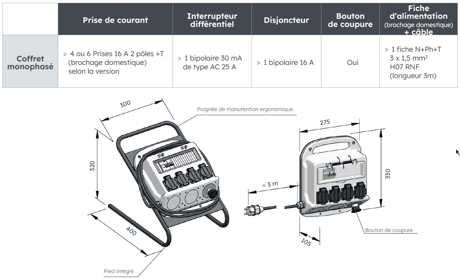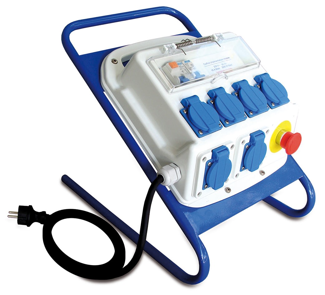 Coffret d'alimentation mobile avec pied équipé de 6 prises 16A brochage domestique 2P+T, 1 interrupteur différentiel bipolaire 30 mA et 1 disjoncteur bipolaire 16A