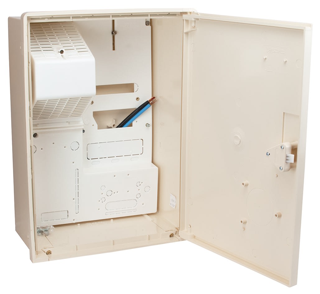 Coffret S20 Mono-Tri avec marquage EDF constitué d'un boîtier S20 Mono-Tri et d'un panneau amovible S20 Mono-Tri. Porte avec serrure rectangulaire 1/4 de tour.