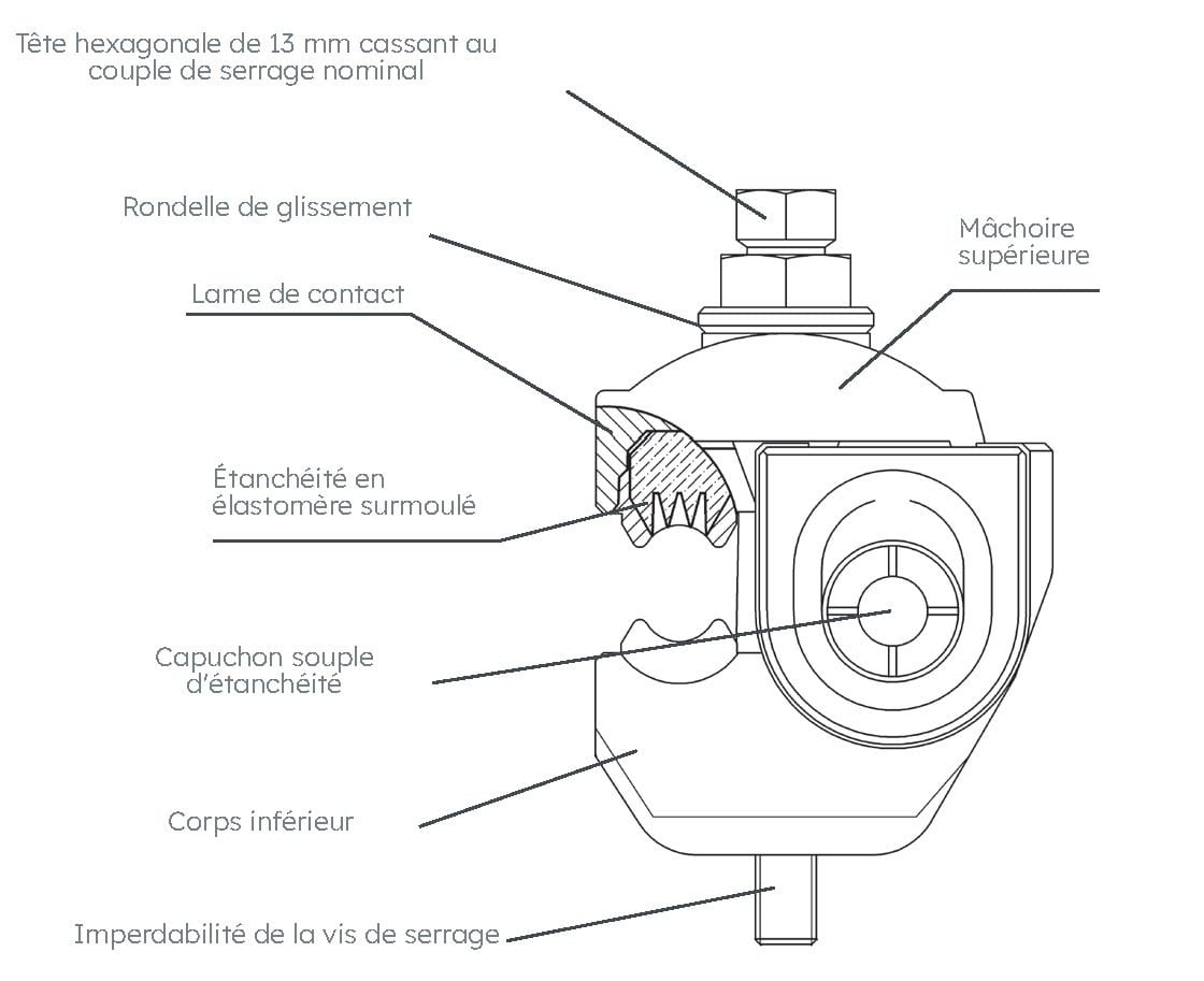 Connecteur de réseau à serrage simultané pour réaliser la dérivation d'un réseau aérien BT en conducteurs isolés torsadés sur un autre réseau de même type. Section du câble principal : 25-150²