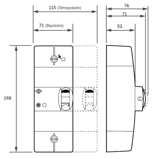 Disjoncteur de branchement différentiel NF. Bipolaire instantané 15-30-45 A. Capacité de raccordement : 50 mm² rigide, 35 mm² souple.