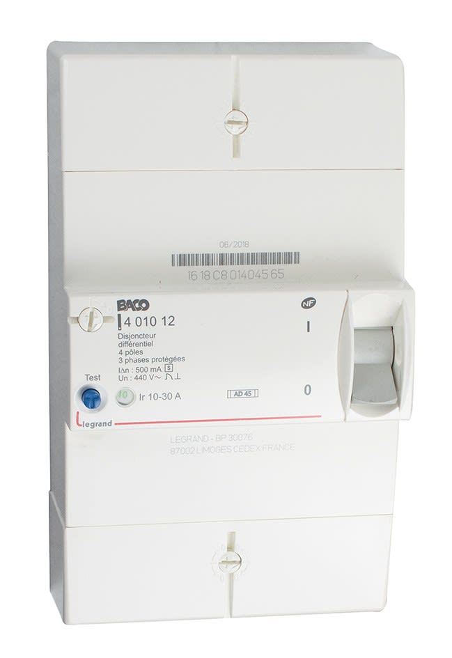 Disjoncteur de branchement différentiel 500 mA NF. Tétrapolaire sélectif 10-30 A.