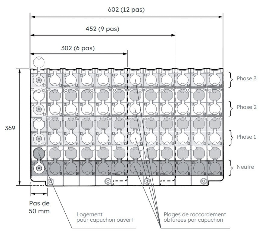 Jeu de barres REMBT, largeur 600 mm. 12 plages de raccordement.
