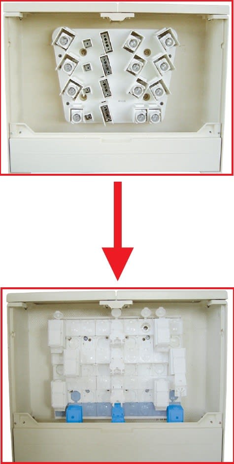 Kit REMBT 300 de substitution GFC S25. Constitué d'un jeu de barres REMBT 300, de 2 modules REMBT réseau 50-240, d'1 module REMBT de repiquage 1N+ 3P et 1 kit de fixation pour socle S15-S20 double.