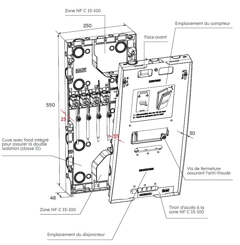 Panneau 250 x 550 pour compteur triphasé et disjoncteur. Conforme à la spécification HN 62-S-80. Avec câblettes de liaison. Version sans logo Enedis.