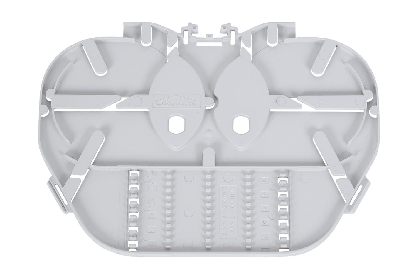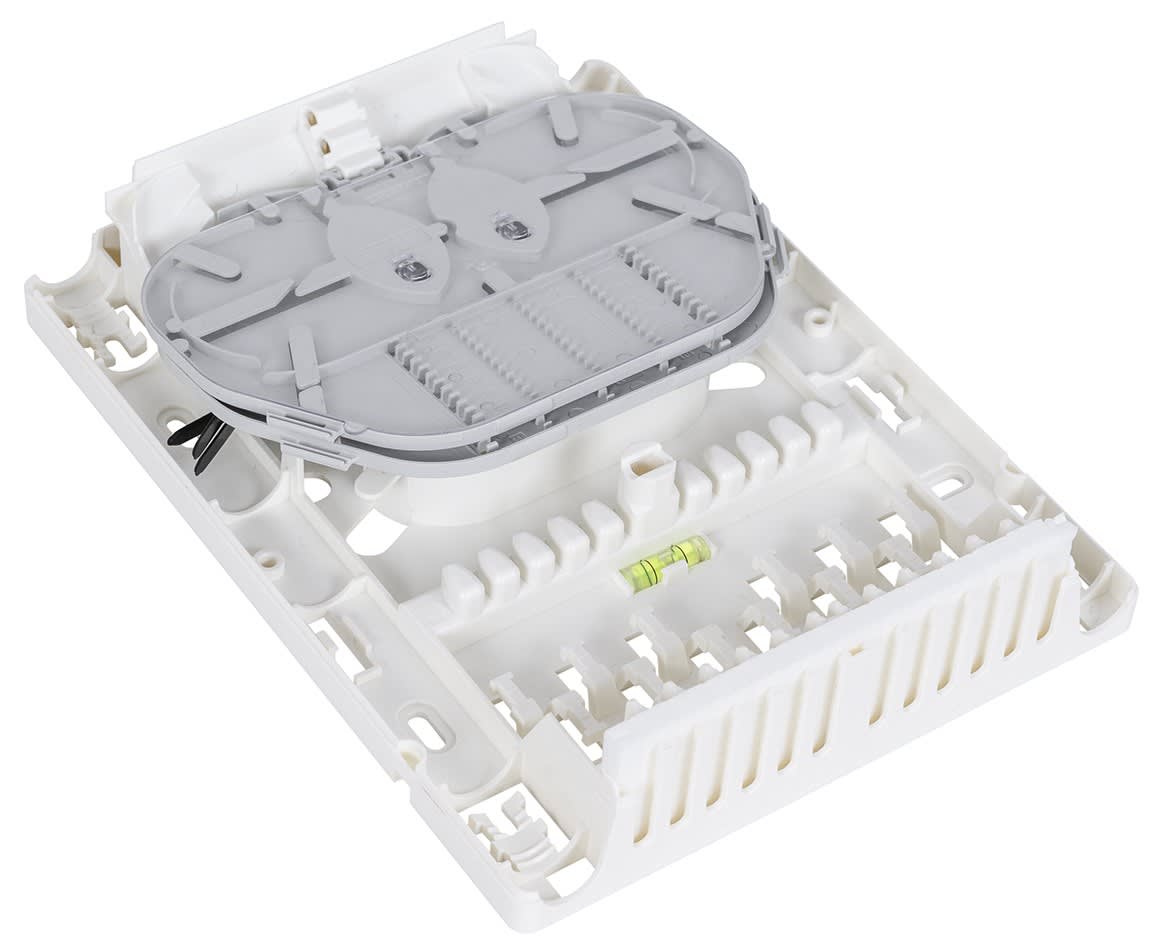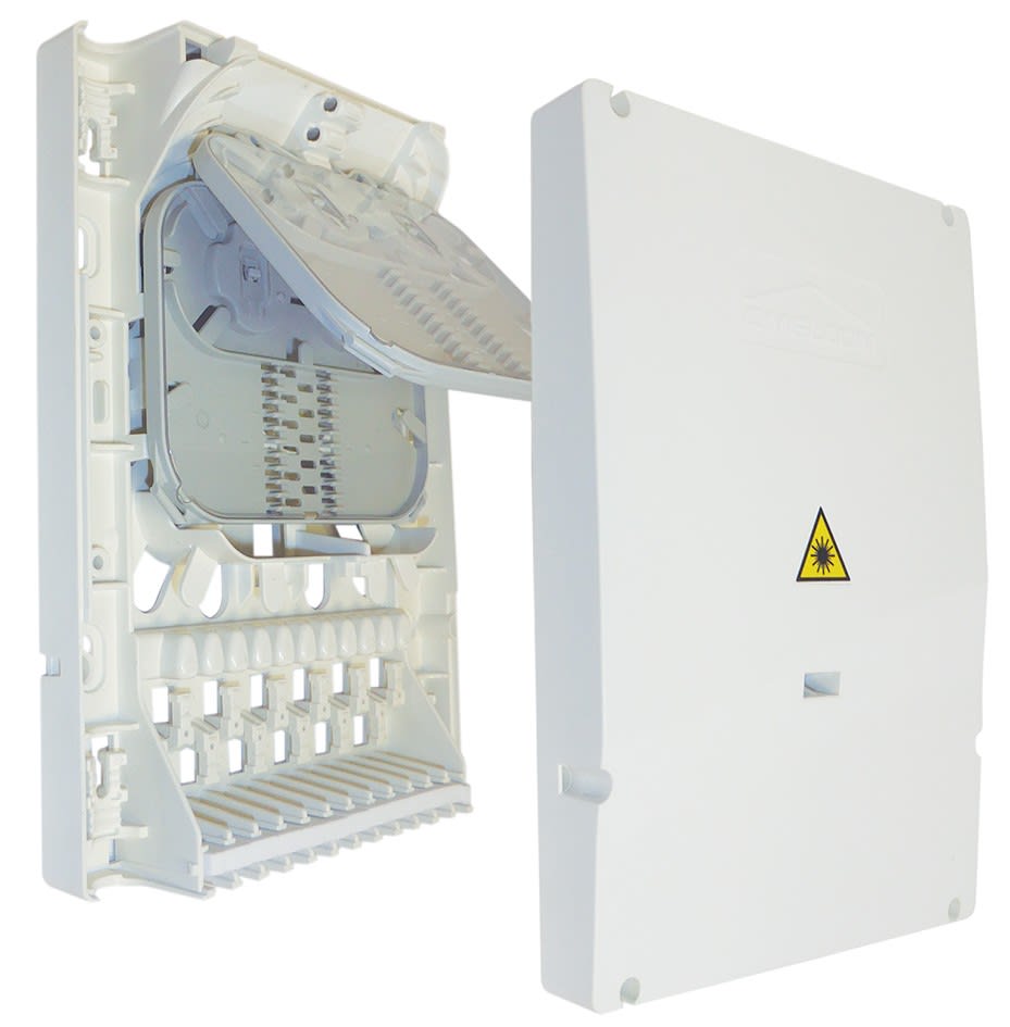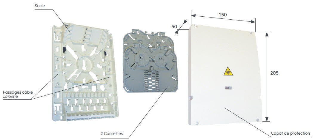 Point de Branchement Optique pour 12 logements 1 ou 2 fibres ou 6 logements 4 fibres. Constitué d'un socle, 2 cassettes, un capot de protection, des colliers de serrage, 1 mousse antipoussière pour départs abonnés, 2 peignes mousse.