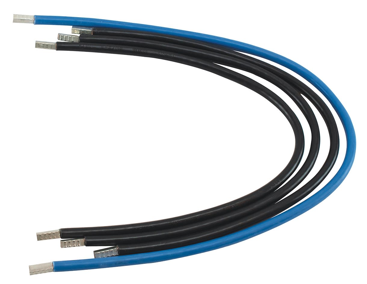 Pack de 4 câblettes de liaison, 1 bleue et 3 noires, de longueur 56 cm et 44 cm, en cuivre de section 16² multibrins souple avec à chaque extrémité une douille en cuivre étamé sertie pour raccordement dans une borne