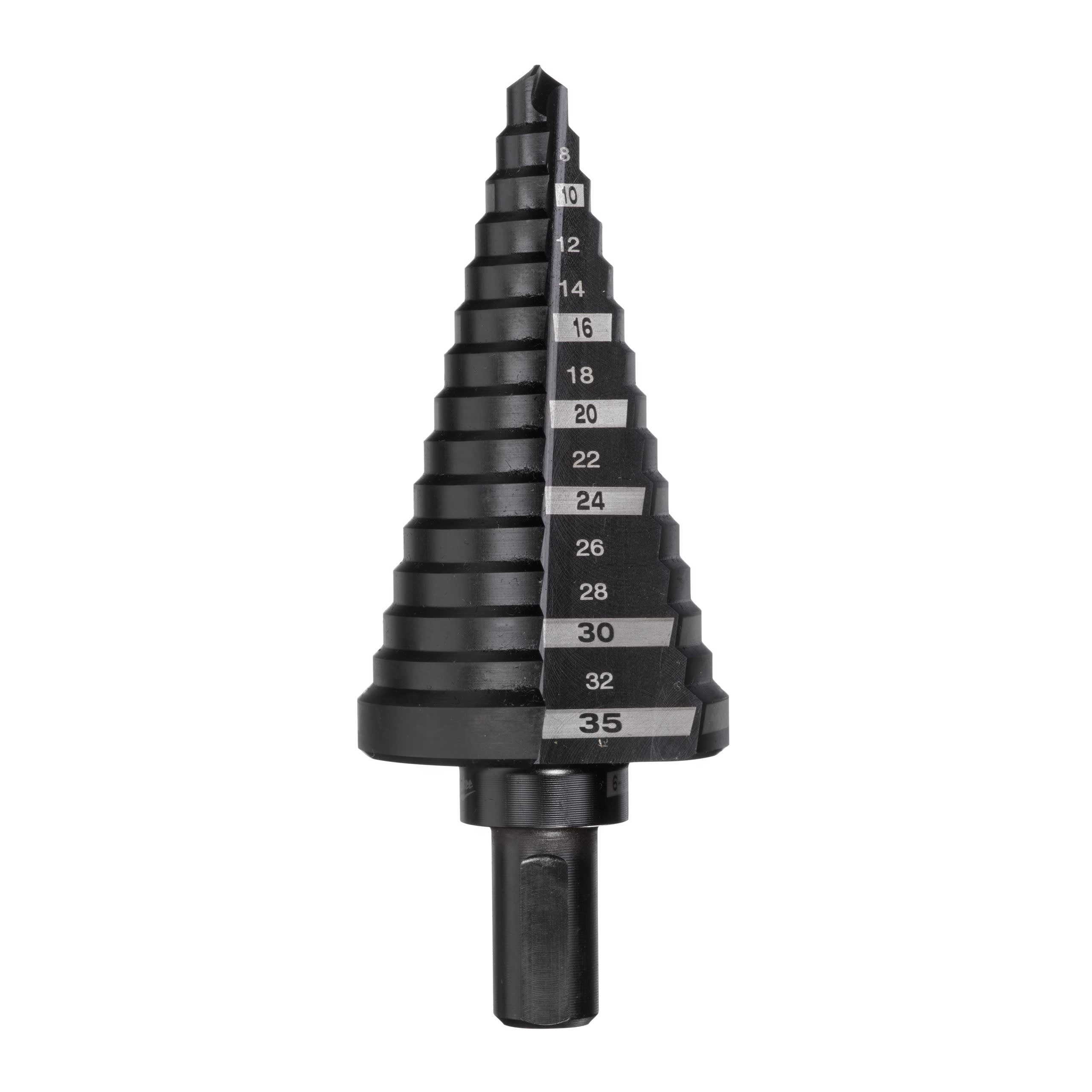 Idéal pour percer dans les matières suivantes: - Métaux ferreux et non ferreux, profilés et tubes. - Cuivre, laiton et aluminium. - Acier inoxydable. - Matières plastiques. - Matériaux de 4 mm d'épaisseur maximale. - Pour assurer une meilleure durée de vie, nous recommandons l'utilisation d'un liquide de refroidissement. Métiers: - Electricité: le forage de panneaux et armoires pour l'installation de câbles. - Plomberie : forage permettant l'accès à la tuyauterie et l'installation. - Automobile : forage pour l'installation du câble (téléphones mobiles, antennes, rediriger le câblage électrique). - Opérations de réparation et d'entretien: diverses applications Avantages par rapport aux forets classiques: - Un embout pour percer plusieurs tailles - Gain de place - Parfait pour élargir les trous existants - Résistance et durabilité accrue - Perçage net et précis Avantages Milwaukee® Perçage et débourrage en une seule fois Départ rapide pour une meilleure précision, sans nécessité de pré-percer. La forme étagée permet une meilleure performance sans bourrage. Moins de risque d'accrochage lorsqu'il est utilisé avec les outils sans fil à haute vitesse et empêche également la déformation du matériau percé . 2 flûtes avec une géométrie optimisée pour une coupe lisse et rapide. Produit fabriqué sur mesure à partir d'acier revêtu d'oxyde noir pour une durée de vie accrue. Optimisé pour une utilisation avec des machines sans fil. Tailles gravées au laser pour une meilleure visibilité à long terme. Chaque étagement est une aide pour percer et évacuer facilement. Avec 3 méplats pour un serrage sécurisé dans le mandrin et assurer une transmission maximale du couple.