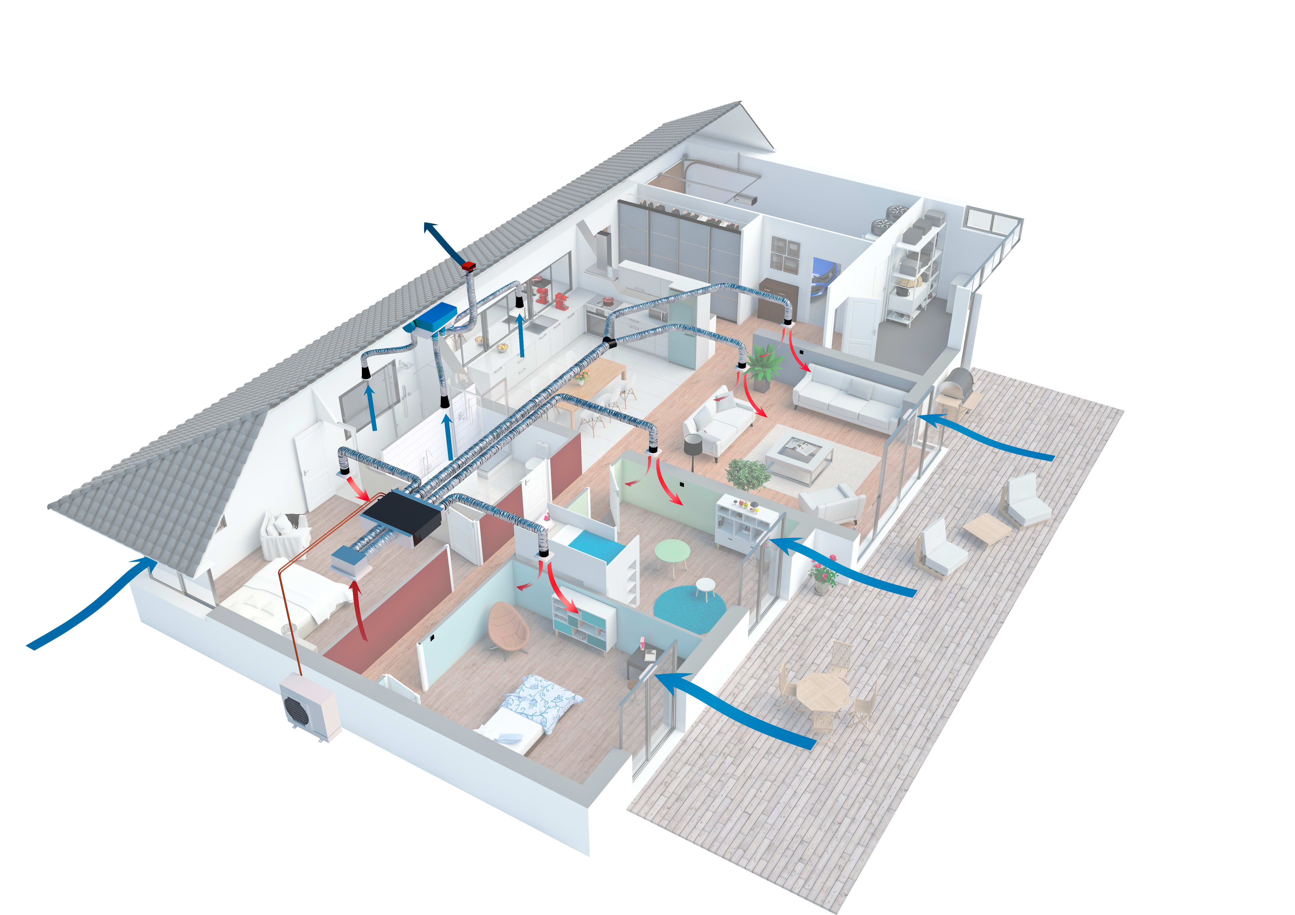 Unité intérieure gainable + Plénum à registres motorisés 4Ø160 et 1Ø200 + 2 Plénums de reprise 500 x 400, Kit de diffusion par grilles double déflexion pour 5 pièces.