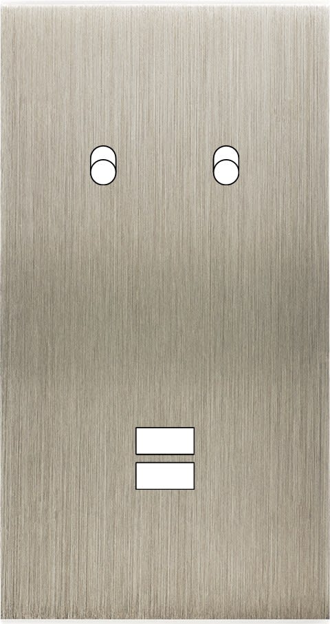 Façade Confidence en laiton massif finition Acier Brossé double verticale 2 basculeurs ouverture pour chargeur double USB. Dimensions : 151x80x5mm, deux chanfreins biseautés. A associer à nos mécanismes. Fabriqué en France.