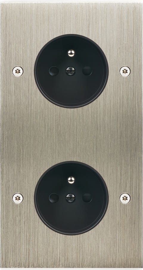 Façade Confidence en laiton massif finition Acier Brossé double verticale prise de courant 2P+T prise de courant 2P+T . Façade à vis. Dimensions 80x151x5mm. Fabriqué en France.