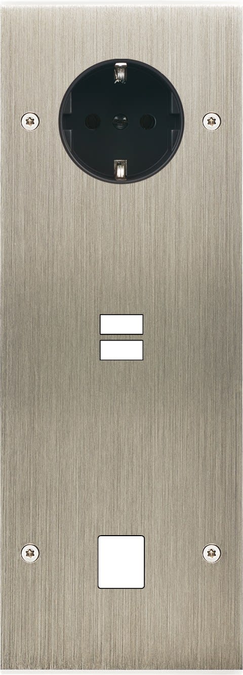 Façade Confidence en laiton massif finition Acier Brossé triple verticale prise schuko 2P+T ouverture pour chargeur double USB 1 média vis