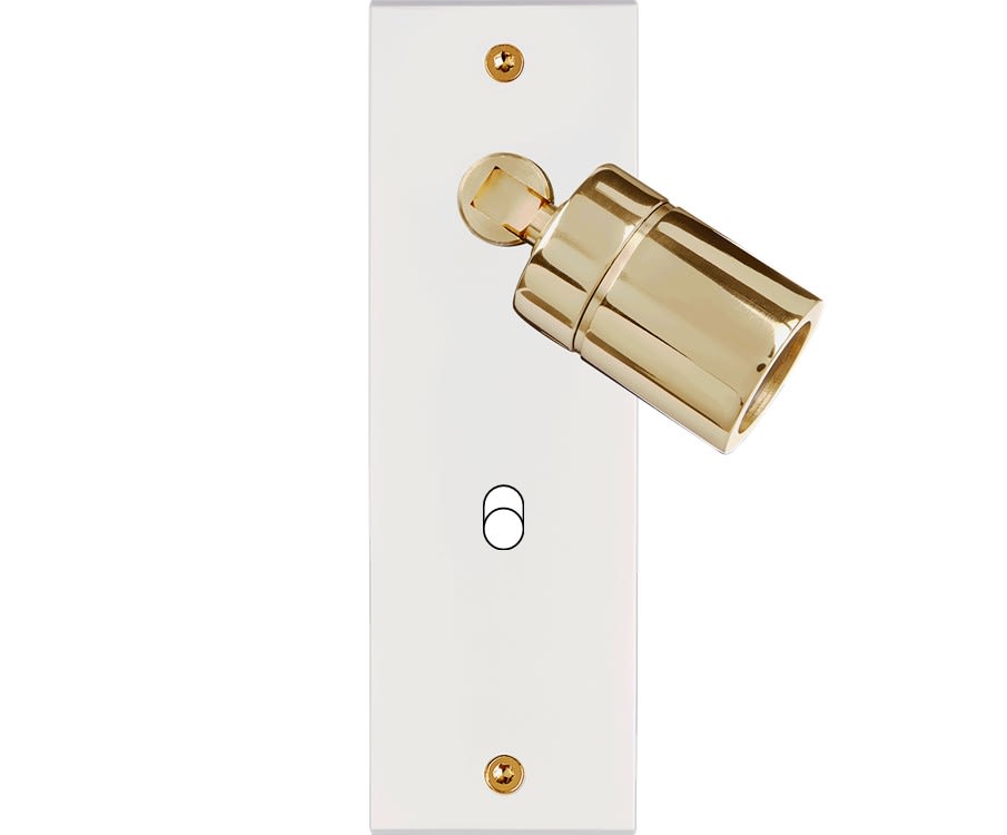 Façade Confidence en laiton massif finition Blanc Email étroite longue spot 360° + 1 basculeur. Dimensions : 40x126x5mm, deux chanfreins biseautés. A associer à nos leviers en laiton massif. Fabriqué en France.