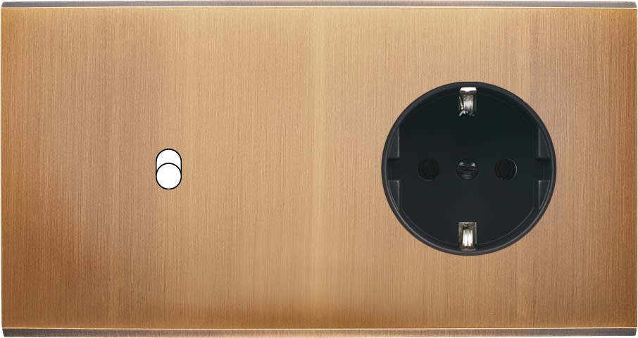Façade Confidence en laiton massif finitionà visieux Bronze double horizontale 1 Basculeur 1 prise Schuko. Dimensions : 151x80x5mm, deux chanfreins biseautés. A associer à nos mécanismes. Fabriqué en France.