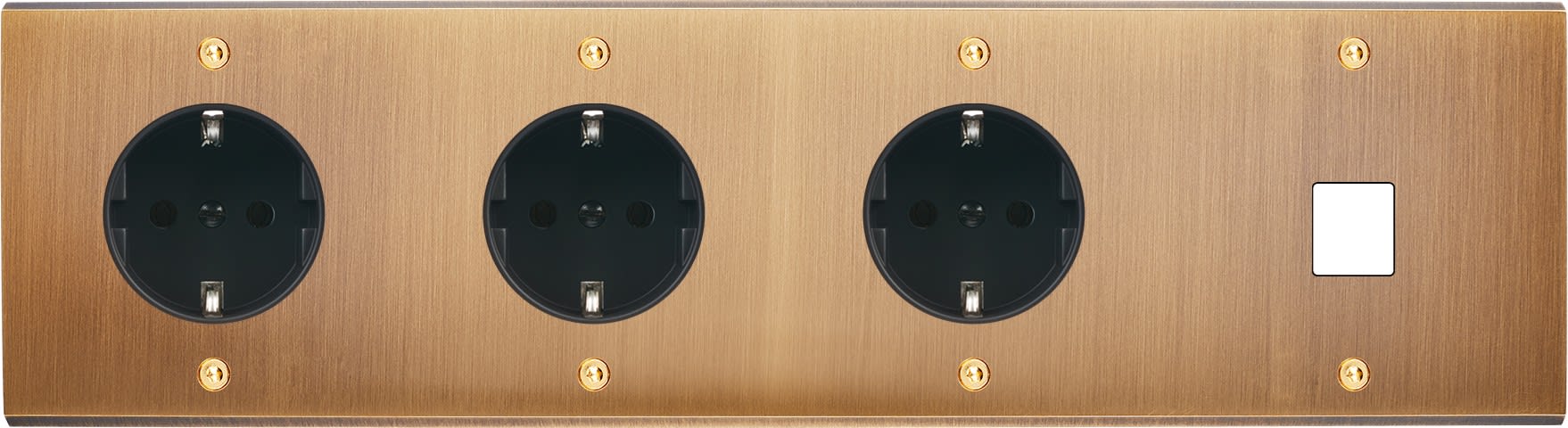 Façade Confidence en laiton massif finition à visieux Bronze quadruple horizontale 3x1 prise Schuko 1 MEDIA à vis