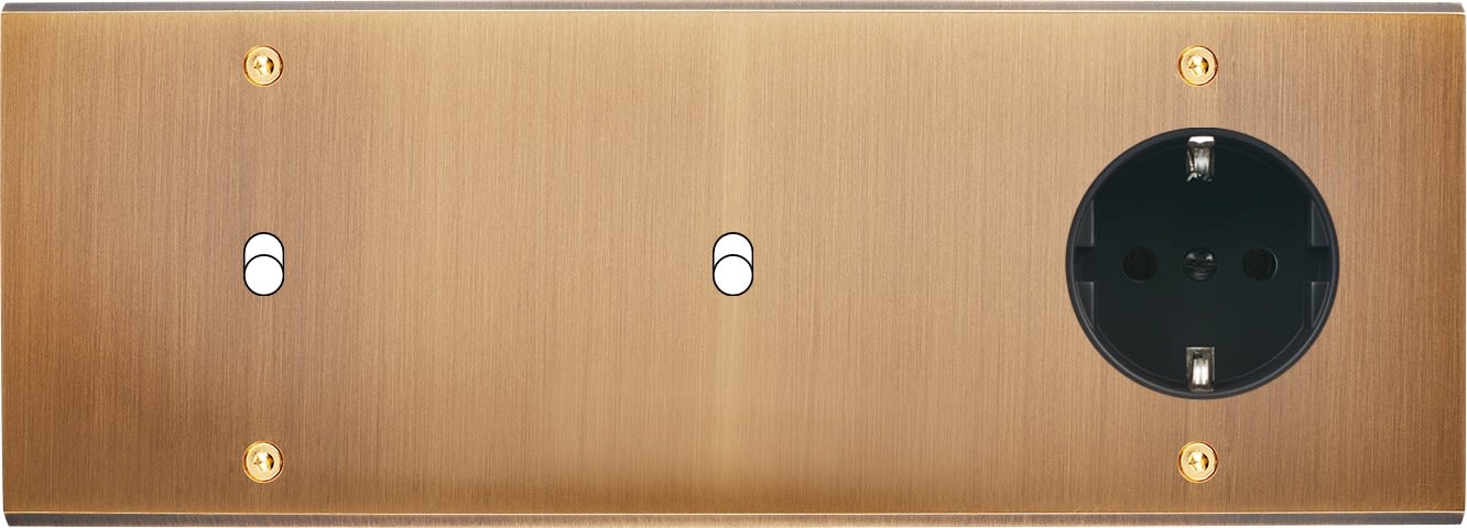 Façade Confidence en laiton massif finition à visieux Bronze triple horizontale 1 Basculeur 1 Basculeur 1 prise Schuko à vis. Dimensions : 222x80x5mm, deux chanfreins biseautés. A associer à nos mécanismes. Fabriqué en France.