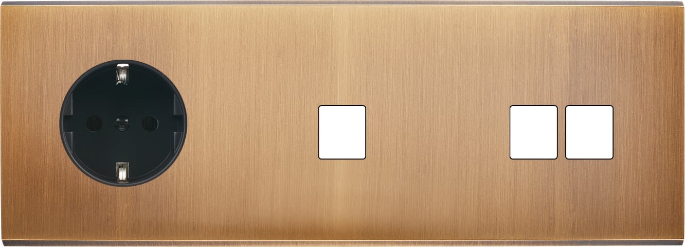 Laiton massif 5mm - 222x80mm, horizontal ou vertical - 12 finitions disponibles et plus de 50 fonctions - Montage sur boîtiers standards profondeur 50mm - Montage aimanté ou à vis