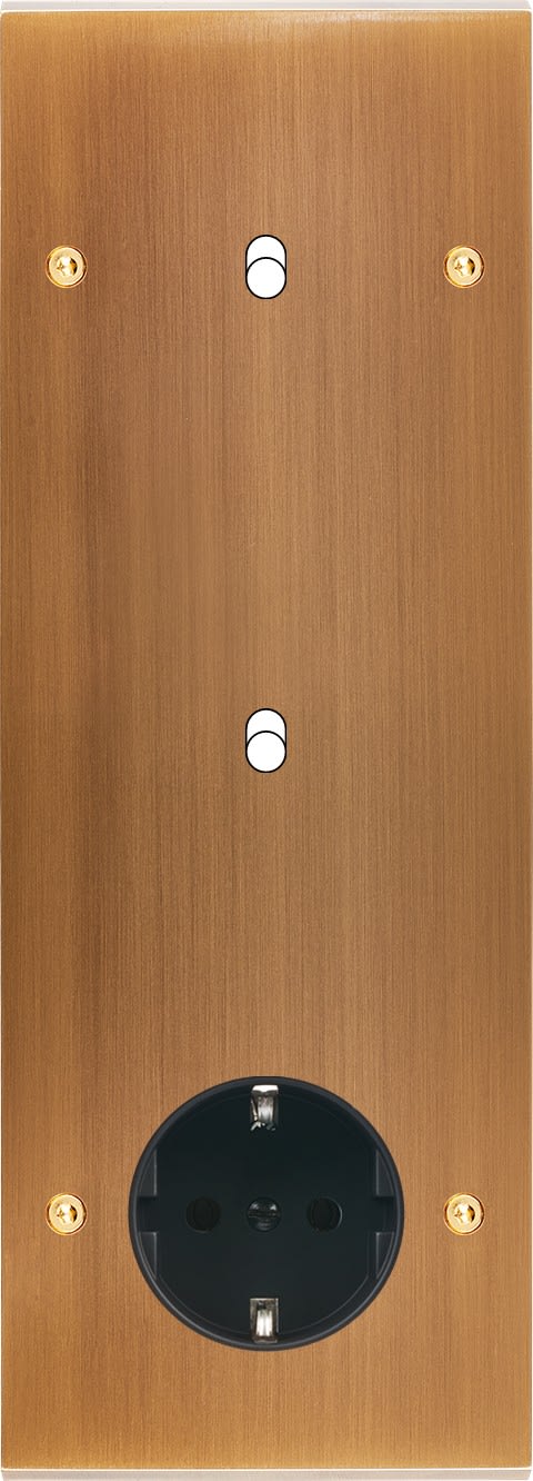 Façade Confidence en laiton massif finition à visieux Bronze triple verticale 1 Basculeur 1 Basculeur 1 prise Schuko à vis. Dimensions : 80x222x5mm, deux chanfreins biseautés. A associer à nos leviers en laiton massif. Fabriqué en France.