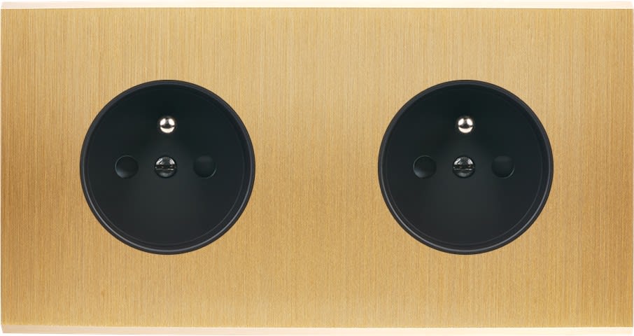 Façade Confidence en laiton massif finition Brossé double horizontale prise 2P+T prise 2P+T. Façade magnétique. Deux chanfreins biseautés. Dimensions 151x80x5mm. Fabriqué en France.