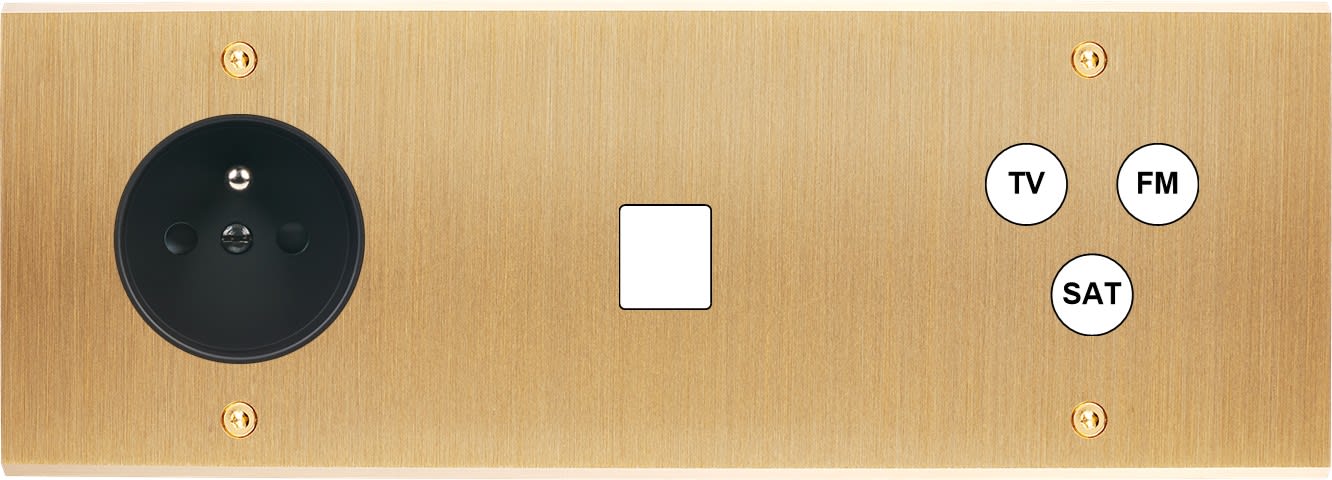 Façade Confidence en laiton massif finition Brossé triple horizontale prise de courant 2P+T 1 média 1 TV-FM-SAT . Façade à vis. Dimensions 222x80x5mm. Fabriqué en France.