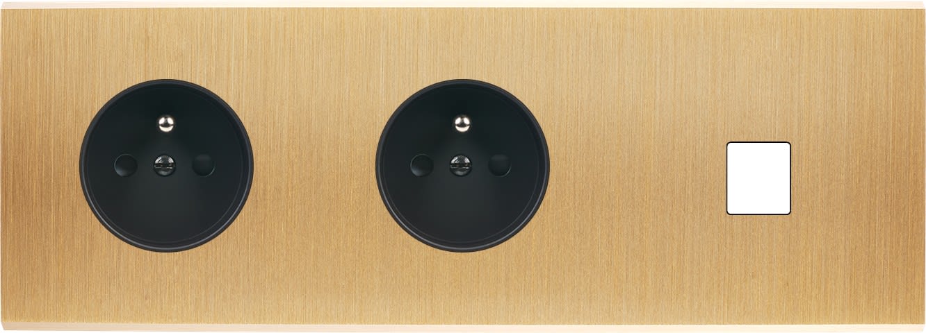 Façade Confidence en laiton massif finition Brossé triple horizontale prise 2P+T prise 2P+T 1 MEDIA. Façade magnétique. Deux chanfreins biseautés. Dimensions 222x80x5mm. Fabriqué en France.