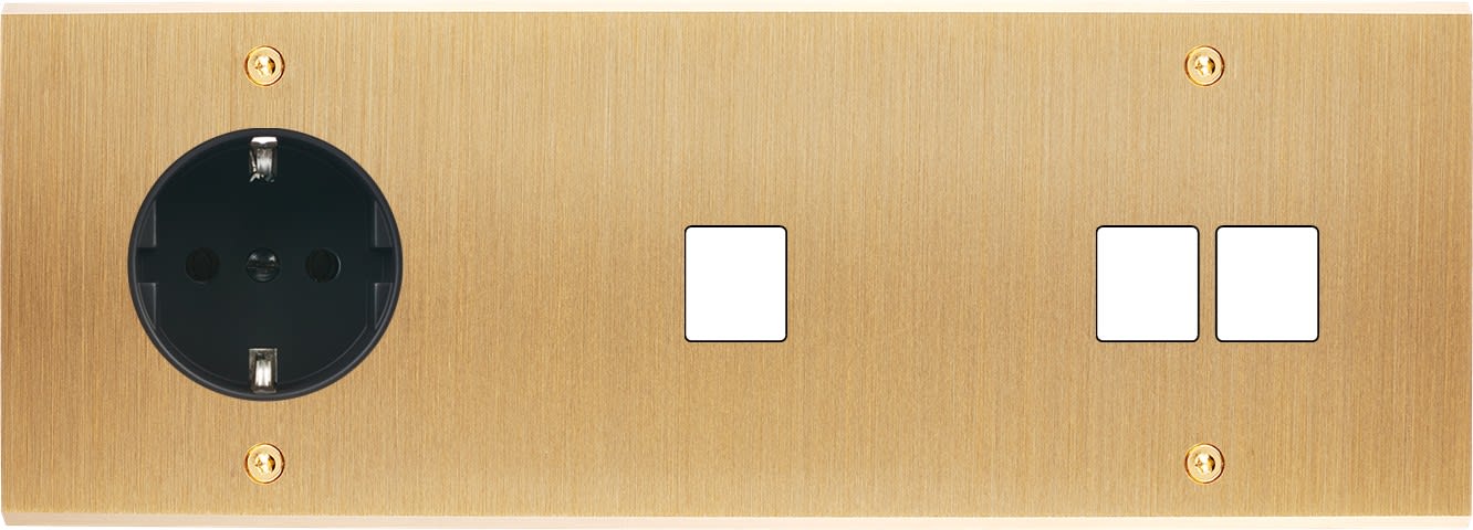 Façade Confidence en laiton massif finition Brossé triple horizontale 1 prise Schuko 1 MEDIA 2 MEDIA à vis