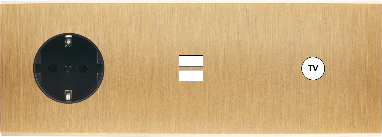 Façade Confidence en laiton massif finition Brossé triple horizontale prise schuko 2P+T ouverture pour chargeur double USB 1 TV