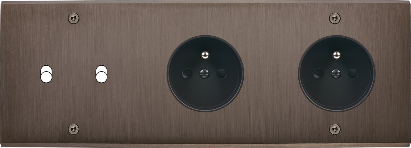 Façade Confidence en laiton massif finition Canon de Fusil triple horizontale 2 basculeurs prise de courant 2P+T prise de courant 2P+T à vis. Dimensions : 222x80x5mm, deux chanfreins biseautés. Fabriqué en France.