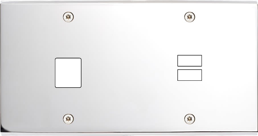 Façade Confidence en laiton massif finition Chrome double horizontale 1 média ouverture pour chargeur double USB . Façade à vis. Dimensions 151x80x5mm. Fabriqué en France.