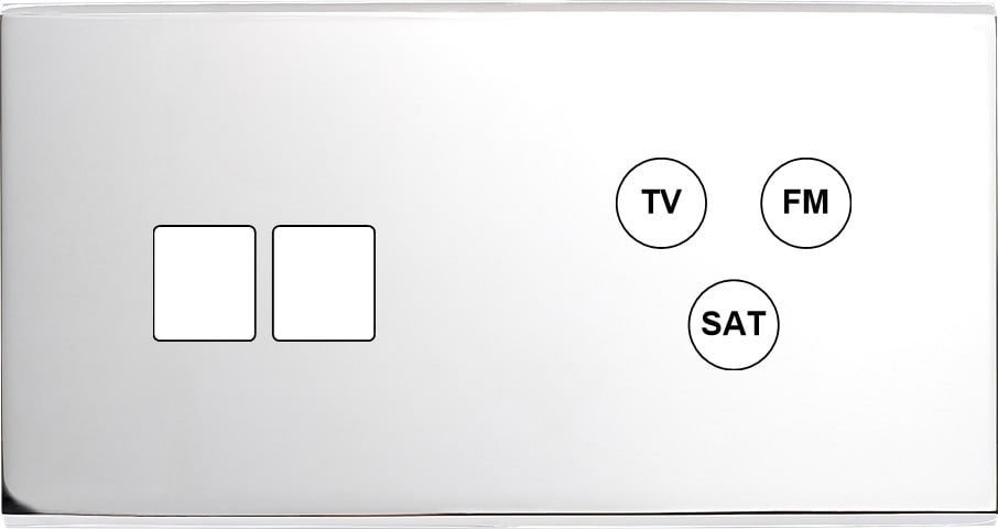 Façade Confidence en laiton massif finition Chrome double horizontale 2 MEDIA TV-FM-SAT. Façade magnétique. Deux chanfreins biseautés. Dimensions 151x80x5mm. Fabriqué en France.