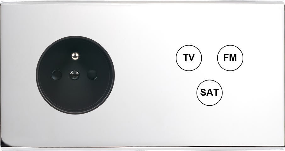 Façade Confidence en laiton massif finition Chrome double horizontale prise 2P+T TV-FM-SAT. Façade magnétique. Deux chanfreins biseautés. Dimensions 151x80x5mm. Fabriqué en France.