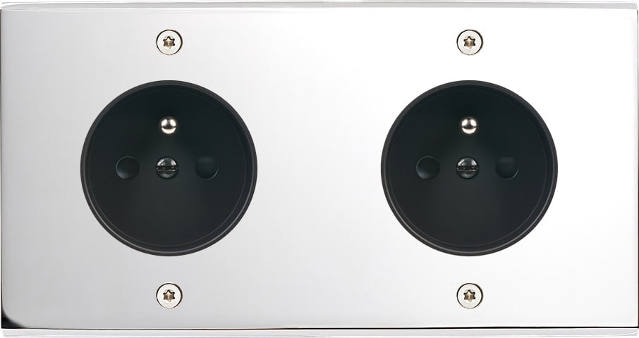 Façade Confidence en laiton massif finition Chrome double horizontale prise de courant 2P+T prise de courant 2P+T. Façade à vis. Dimensions 151x80x5mm. Fabriqué en France.