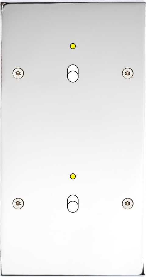 Façade Confidence en laiton massif finition Chrome Miroir double verticale 1 basculeur+LED 1 basculeur+LED à vis. Dimensions : 80x151x5mm, deux chanfreins biseautés. A associer à nos leviers en laiton massif. Fabriqué en France.