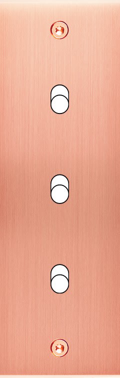 Façade Confidence en laiton massif finition Cuivre Satiné étroite longue 3 basculeurs, à vis. Dimensions : 126x80x5mm, deux chanfreins biseautés. A associer avec nos leviers en laiton massif. Fabriqué en France.