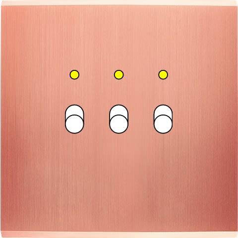 Façade Confidence en laiton massif finition Cuivre Satiné simple 3 basculeurs+LED magnétique. Dimensions : 80x80x5mm, deux chanfreins biseautés. Fabriqué en France.