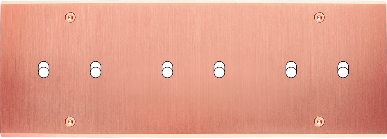 Laiton massif 5mm - Format triple horizontal 222x80mm - 12 finitions disponibles et plus de 50 fonctions - Montage sur boîtiers standards profondeur 50mm - Façade à vis