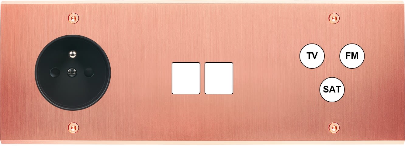 Laiton massif 5mm - Format triple horizontal 222x80mm - 12 finitions disponibles et plus de 50 fonctions - Montage sur boîtiers standards profondeur 50mm - Façade à vis