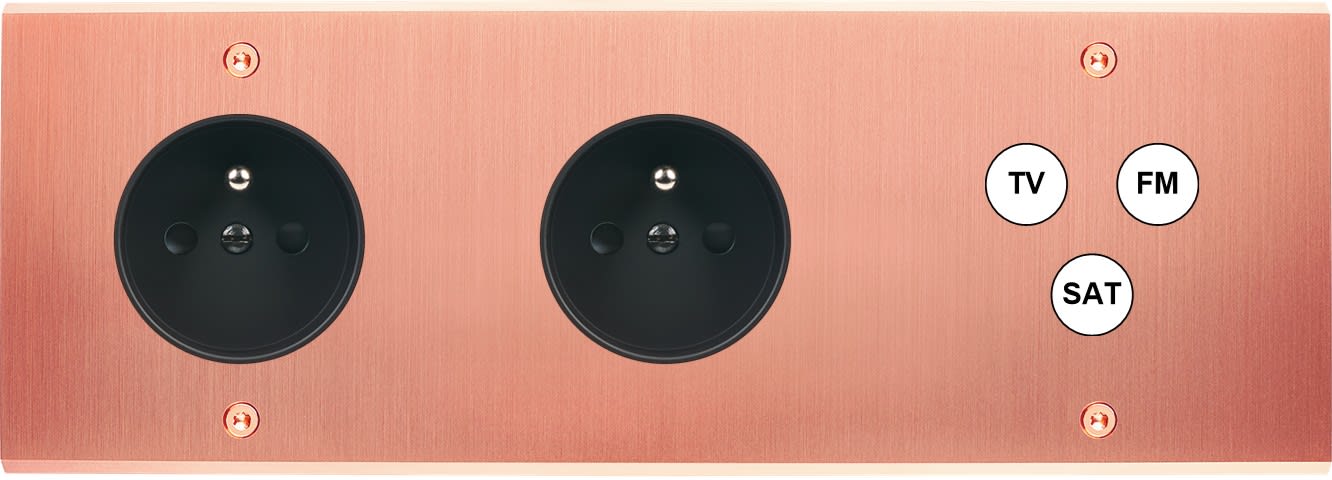 Laiton massif 5mm - Format triple horizontal 222x80mm - 12 finitions disponibles et plus de 50 fonctions - Montage sur boîtiers standards profondeur 50mm - Façade à vis