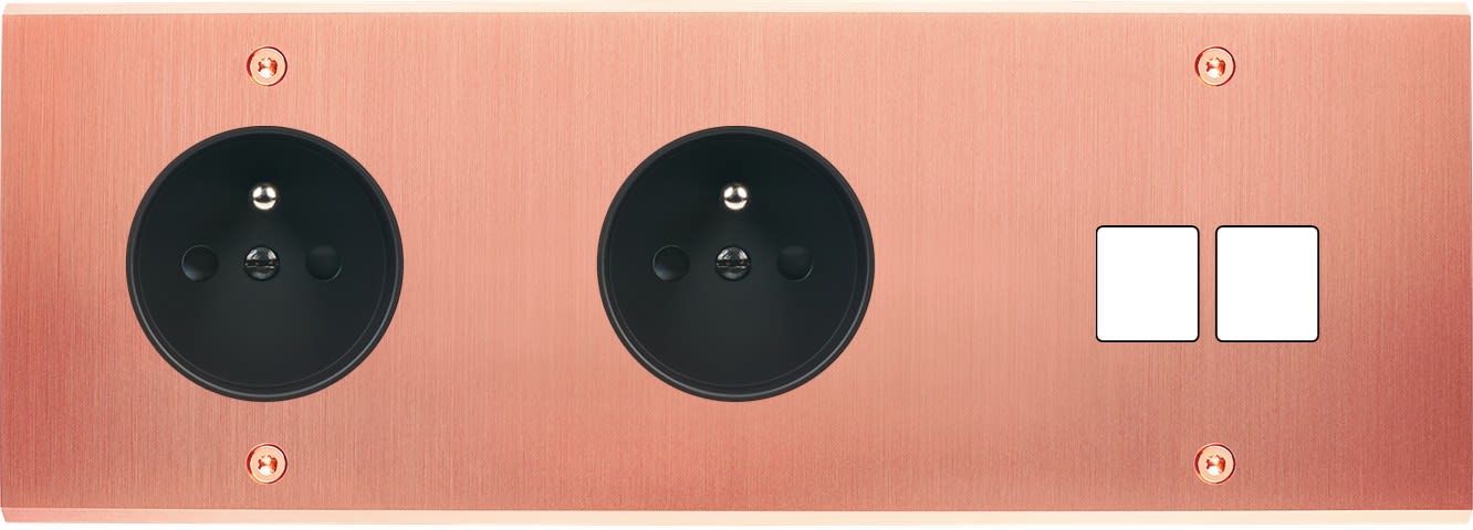 Laiton massif 5mm - Format triple horizontal 222x80mm - 12 finitions disponibles et plus de 50 fonctions - Montage sur boîtiers standards profondeur 50mm - Façade à vis