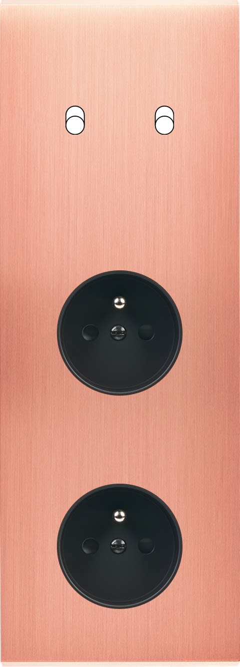 Façade Confidence en laiton massif finition Cuivre Satiné triple verticale 2 basculeurs prise 2P+T prise 2P+T. Dimensions : 80x222x5mm, deux chanfreins biseautés. A associer à nos leviers en laiton massif. Fabriqué en France.