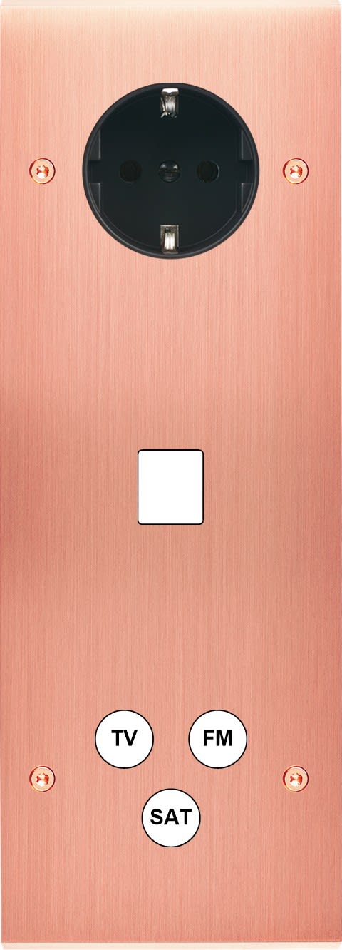Façade Confidence en laiton massif finition Cuivre Satiné triple verticale 1 prise Schuko 1 MEDIA TV-FM-SAT à vis
