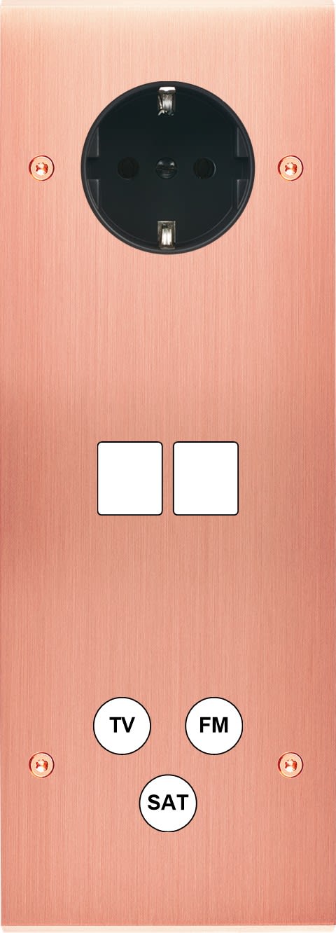 Façade Confidence en laiton massif finition Cuivre Satiné triple verticale 1 prise Schuko 2 MEDIA TV-FM-SAT à vis