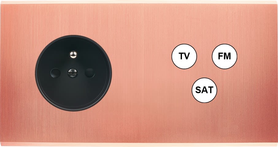 Laiton massif 5mm - 151x80mm, horizontal ou vertical - 12 finitions disponibles et plus de 50 fonctions - Montage sur boîtiers standards profondeur 50mm - Montage aimanté ou à vis