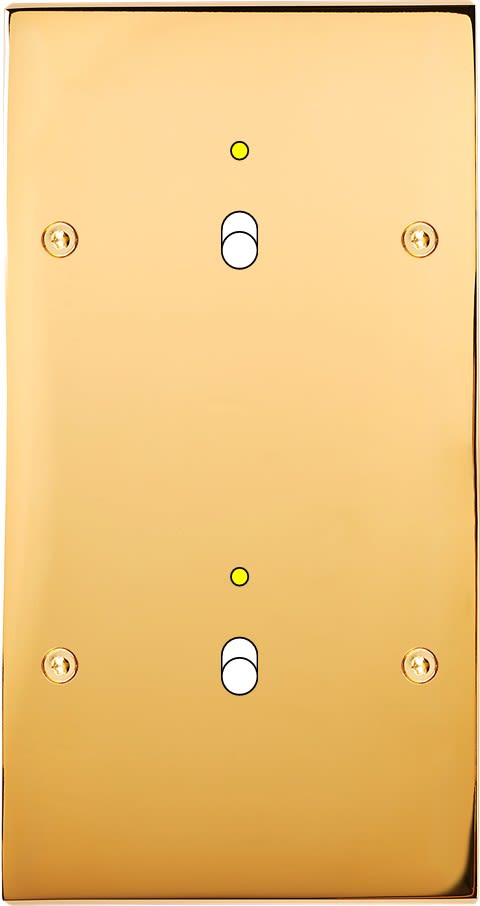 Façade Confidence en laiton massif finition Or Miroir double verticale 1 basculeur+LED 1 basculeur+LED à vis. Dimensions : 80x151x5mm, deux chanfreins biseautés. A associer à nos leviers en laiton massif. Fabriqué en France.