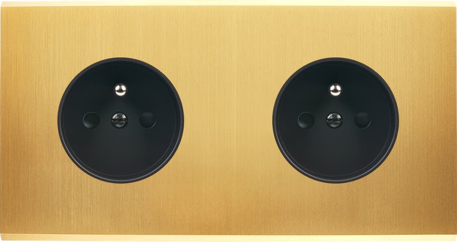 Façade Confidence en laiton massif finition Satiné double horizontale prise 2P+T prise 2P+T. Façade magnétique. Deux chanfreins biseautés. Dimensions 151x80x5mm. Fabriqué en France.